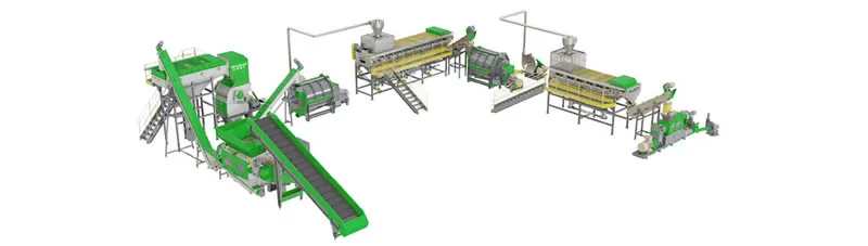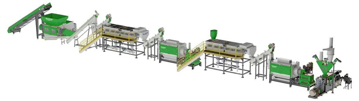 Lini pencucian dan pengeringan ini dirancang untuk membersihkan dan mengeringkan limbah plastik yang terbuat dari polyethylene (LLDPE, LDPE, HDPE) dan polypropylene (PP), baik dalam bentuk kaku maupun film.