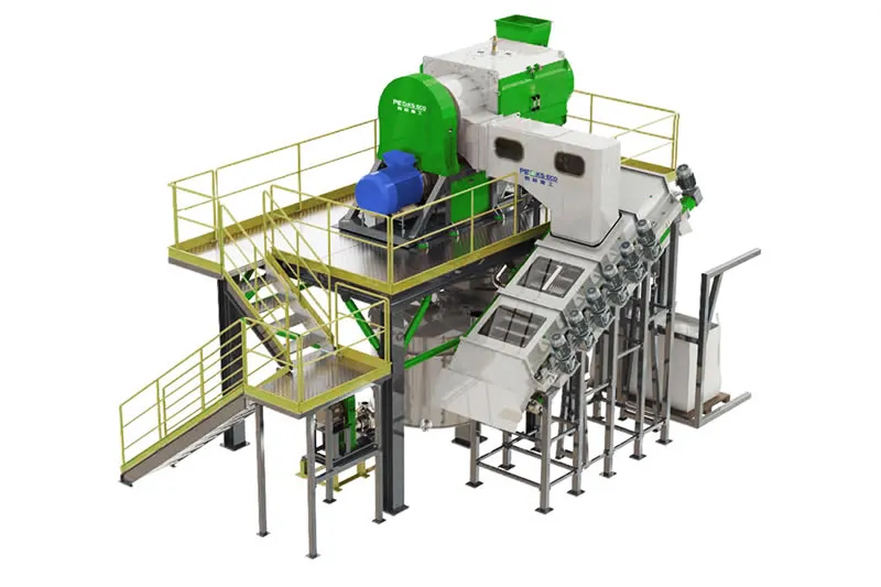 Lini pencucian PET mencakup proses seperti pra-pencucian dan penyortiran, penghancuran, pemisahan sink-float, pencucian panas dan dingin, penghapusan label, serta pengeringan. Material PET limbah pertama-tama masuk ke tahap pra-pencucian untuk pembersihan permukaan dan disortir secara manual atau otomatis. Selanjutnya, material dihancurkan, dan serpihan plastik yang dihasilkan dibersihkan secara menyeluruh melalui unit pencucian panas dan dingin. Akhirnya, serpihan PET yang telah dibersihkan dan dikeringkan dimurnikan lebih lanjut melalui penghapusan label dan kotoran.